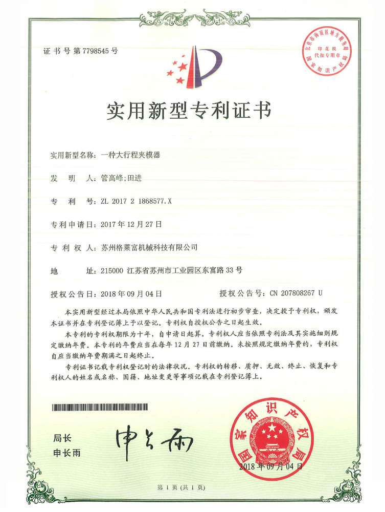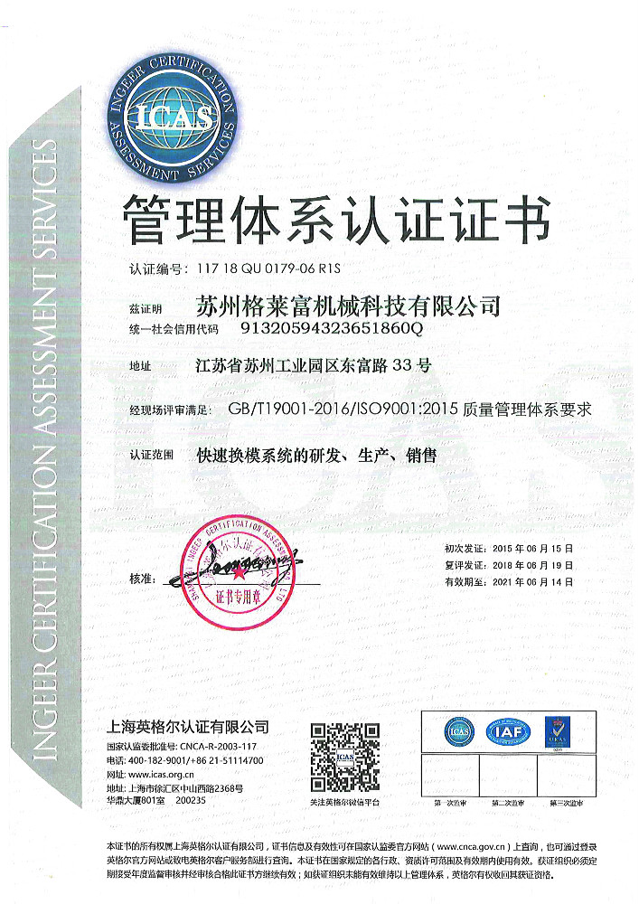 蘇州格萊富機(jī)械科技有限公司坐落于風(fēng)景秀麗的蘇州工業(yè)園區(qū),是一家專注于快速換模系統(tǒng)研發(fā)、設(shè)計(jì)、生產(chǎn)、銷售及服務(wù)為一體的標(biāo)桿型供應(yīng)商。公司現(xiàn)已榮獲國家高新技術(shù)企業(yè)、江蘇省科技型中小技術(shù)企業(yè)等多項(xiàng)稱號,共獲得70余項(xiàng)國家發(fā)明專利,產(chǎn)品均已通過歐盟C E,ISO9001質(zhì)量管理體系等認(rèn)證。面對市場不斷出現(xiàn)的新挑戰(zhàn),格萊富助力企業(yè)發(fā)展,為工業(yè)生產(chǎn)提供模具裝夾、模具快換、模具搬運(yùn)、模具倉儲(chǔ)等完善的換模自動(dòng)化整體解決方案。使企業(yè)不但實(shí)現(xiàn)模具快速更換、智能轉(zhuǎn)運(yùn)、精益生產(chǎn),還提高效率,優(yōu)化工藝,強(qiáng)化競爭優(yōu)勢。
