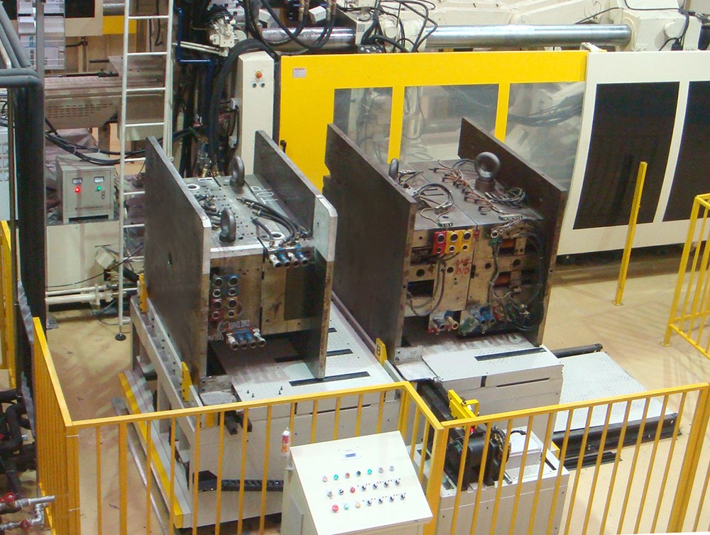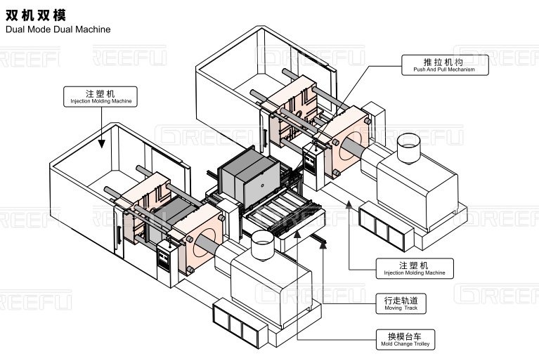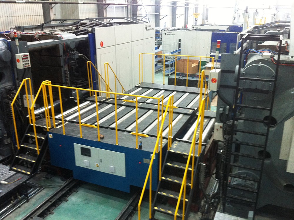 多臺注塑機共用一套自動換模臺車系統,該“自動換模臺車系統”能有效解決大型模具的換模作業,如汽車鈑金、家電電梯等行業沖壓零件,且格萊富可依各種獨立作業需求研究開發各種搬運臺車,并可設計單鍵全自動或半自動對模具的搬入搬出,同時,現在該模具輸送系統也已逐漸被業內接受與采用,尤其是,汽機車零組件等需大型模具的制造業等。